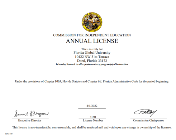 Estamos autorizados para operar y ofrecer nuestra propuesta académica desde el año 2004 por la Comisión para la Educación Independiente del Departamento de Educación de la Florida, quien regula la educación privada en el estado de la Florida y por ende de USA.